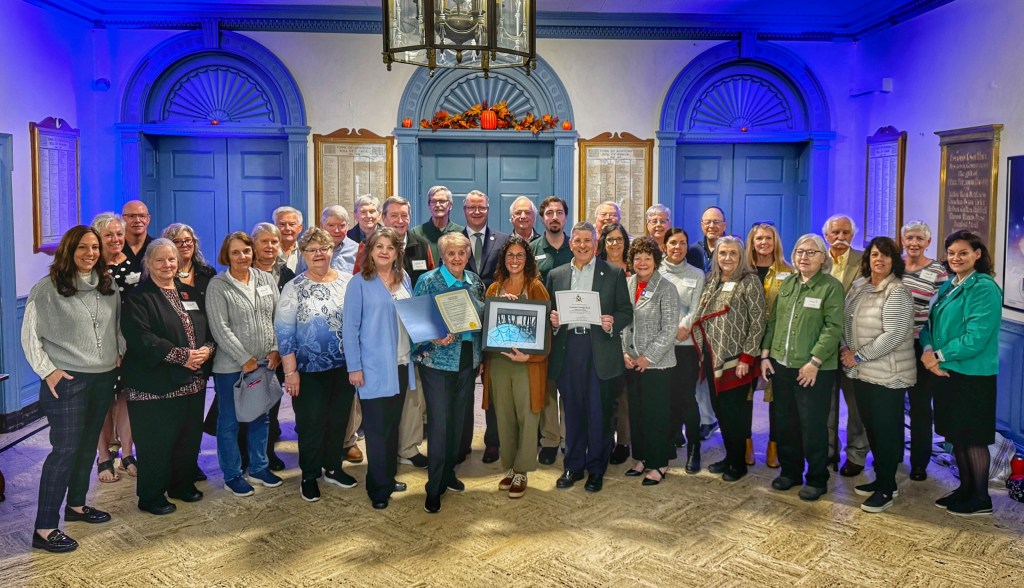 Society President Linda Hawley holds the Proclamation presented by First Selectman Daniel C. Rosenthal proclaiming September 28, 2023 as “Society of The Hawley Family Day” in Newtown. Edmond Town Hall Chairperson Jennifer Guman welcomed us and holds a copy of the 1924 Hawley Society Reunion photograph; and Newtown Savings Bank president Kenneth Weinstein with our Certificate of Appreciation, announced the formation of the “Mary E. Hawley Community Service Award” beginning in 2024 and funded in perpetuity.